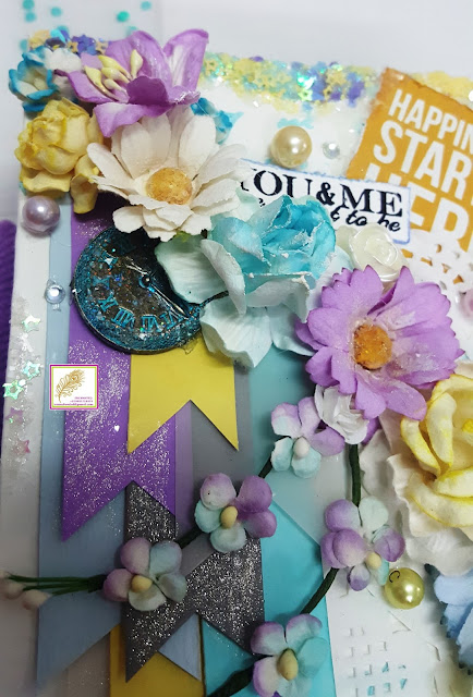 Then comes the fun part.....embellishments and flowers... i have used doilies, mulberry flowers, Mft flourish diecuts, resin frames and flowers, pearls, mdf butterfly diecut, butterflies and much more.....loved this bit and I throughly enjoyed myself.