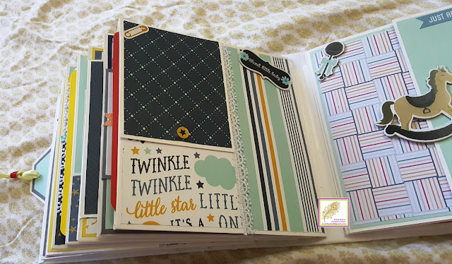 I have a new mini album to share with you all which comes with its own box and 12 onesie tags which can be used for journaling as well. Its a 8" by 8" album with 4 3/4" on the spine. This album has 8 pages and had many interactive elements inside like pockets, flipouts, tuck in spots, tags and photomats.